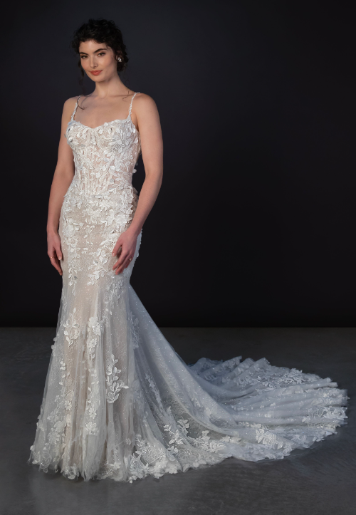This romantic, botanical-inspired fit-and-flare gown features beaded spaghetti straps that melt into a sculpted sweetheart neckline. Expertly designed with a delicate layer of shimmering Chantilly lace, three-dimensional floral appliqués cascade throughout the figure-hugging silhouette. The sheer corset bodice features exposed boning while sculpting the upper body and meeting a basque waistline. To finish, a breathtaking sheer illusion back is paired with an endless row of pearl buttons.