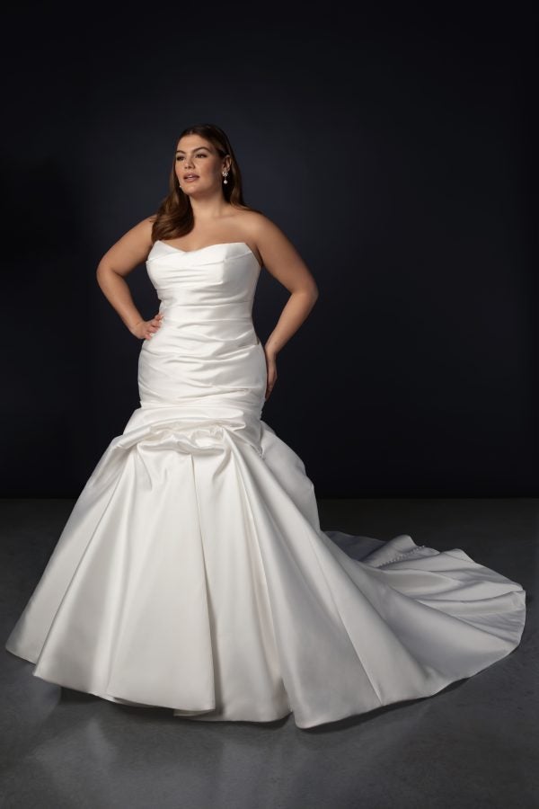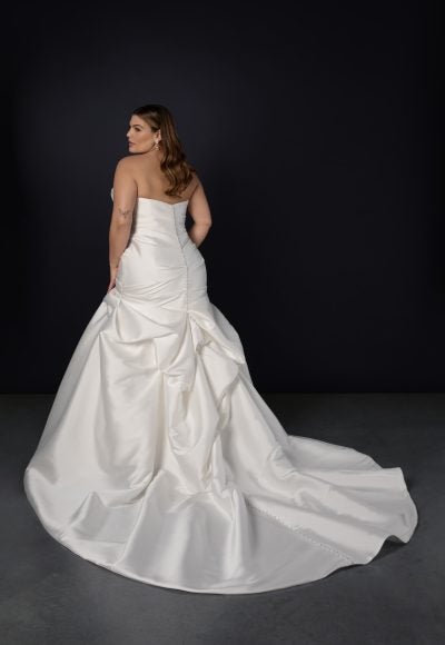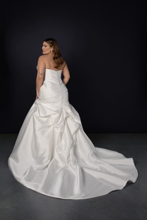 Chic and dramatic, this fit-and-flare gown features a strapless cut and cat-eye, scoop neckline that elegantly frames the décolletage. Expertly designed with Silk Mikado fabric, the structured bodice showcases draping that cascades into the figure-hugging silhouette before erupting into a statement-making skirt. Pick-ups and three-dimensional rosettes adorn the bottom of the design before flowing into a breathtaking train complete with a row of fabric-covered buttons.