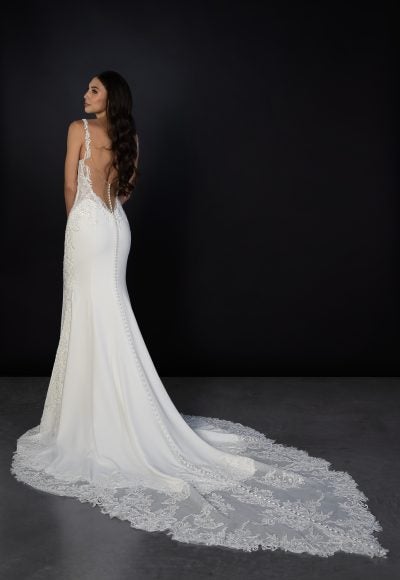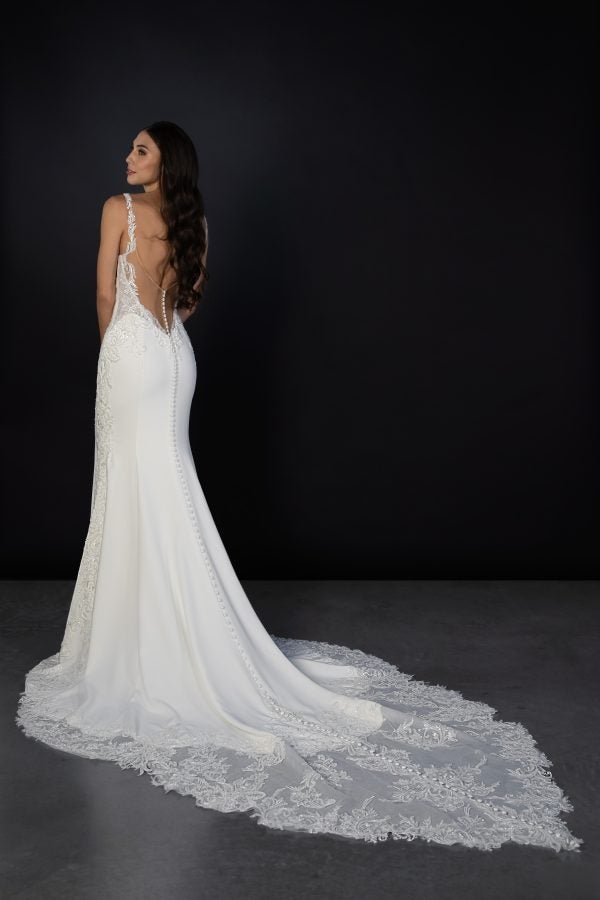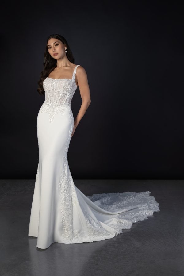 Chic and sophisticated, this sheath gown features a square neckline that elegantly frames the décolletage. Expertly designed with embellished lace appliqués, the corset bodice sculpts the upper body and showcases exposed boning before falling to a basque waistline. The ornate details cascade into the simple, figure-hugging skirt crafted with stretch crepe fabric. To finish, a low, illusion back is paired with a row of fabric-covered buttons that flow into the scalloped train.