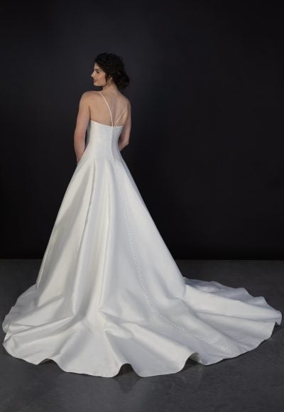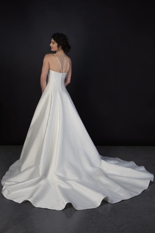 Chic and timeless, this modified A-line gown is expertly designed with a luxurious silk fabric from head to toe. Dainty spaghetti straps and a straight neckline elegantly frame the décolletage while princess seams effortlessly elongate and contour the body. The pleated, full skirt is complemented by an endless row of fabric-covered buttons that flow to [...]