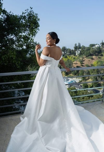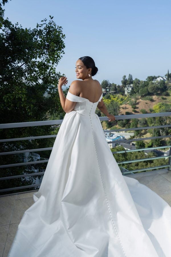 Chic and modern, this ball gown features a pointed sweetheart neckline that cascades into detachable off-the-shoulder straps. Expertly designed with Silk Zibeline fabric, delicate draping melts into a corset bodice with exposed boning. The full, pleated skirt with pockets falls from the natural waistline and cascades into a breathtaking train complete with a row of fabric-covered buttons.