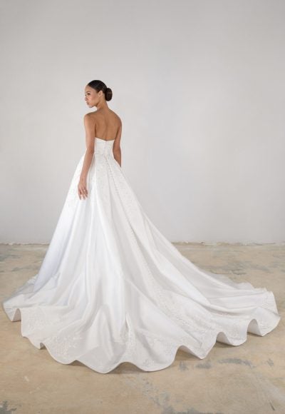 Romance meets timeless elegance with this silk fit-and-flare gown. Featuring a sleek strapless cut that frames the décolletage, the subtly scooped neckline melts into a form-fitting bodice adorned with delicate draping and intricately-embellished lace appliqué. The figure-hugging silhouette pairs exceptionally with the gown’s matching detachable overskirt. The beautiful details and fabric-covered buttons that adorn the voluminous skirt complete this chic and sophisticated bridal look.