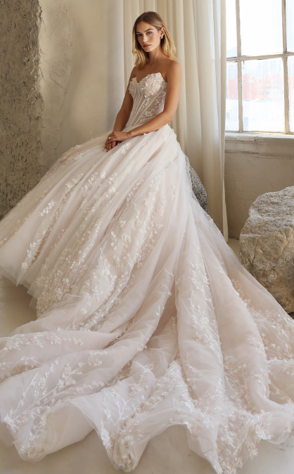 Style #LE1400TUDramatic Basque-Waist Pearl And Floral Ball Gown