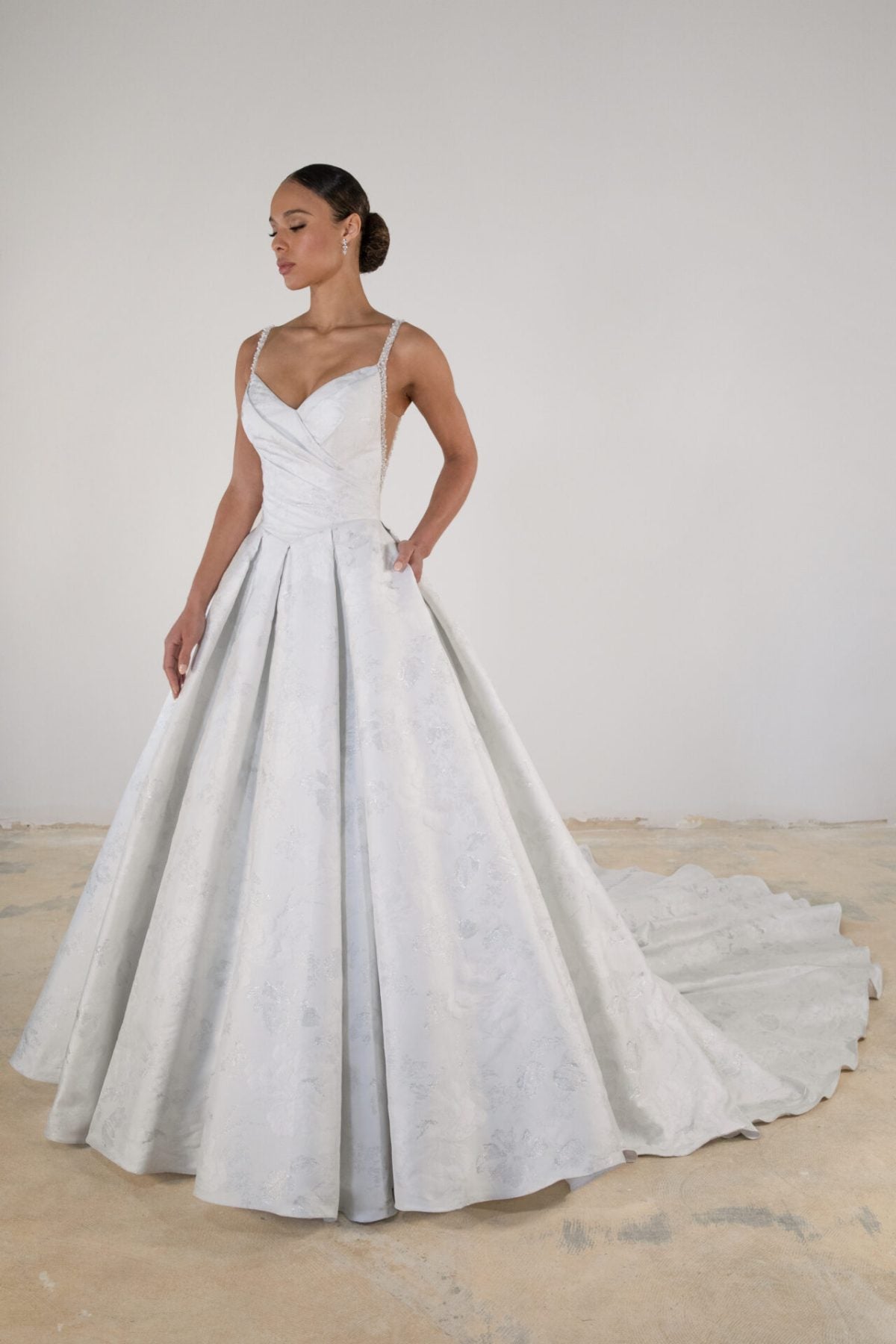 Expertly crafted with shimmering textured jacquard fabric, this exquisite ball gown redefines the princess bride. Its delicately-embellished pearl spaghetti straps melt into a sweeping V-neckline and draped bodice that effortlessly sculpts the upper body. Most notably, the dropped waistline meets a voluminous, pleated skirt and train adorned with fabric-covered buttons. The regal bridal look is complete with side cutouts and an embellished low illusion backline.