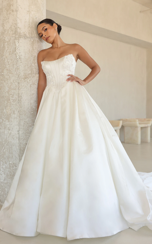 Style #LE1382TU-LSATStrapless Pearl-Embellished Satin Ball Gown