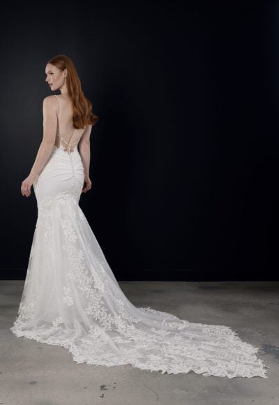 Tastefully sexy and sophisticated, this figure-hugging gown features dainty, pearl-embellished spaghetti straps that cascade into a modern notched sweetheart neckline. Leafy lace appliqués delicately adorn the sheer corset bodice before melting into a sleek crepe skirt. To finish, a breathtakingly open back reveals illusion detail, lightly ruched hips, and fabric-covered buttons flowing to the end of the scalloped lace train.