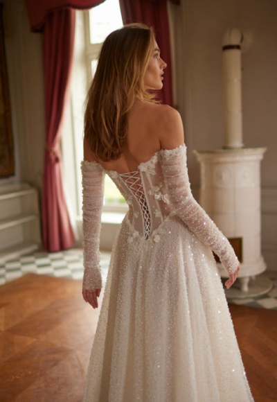 Style #CLEMENTINEEmbellished Basque-Waist A-Line With Off-the-Shoulder Long Sleeves
