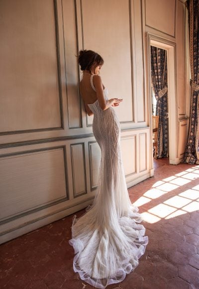 The Athena gown is adorned with elegant pearls from neckline to hem. This style features a vertical beadwork pattern, a strikingly low back, and a feminine, form-fitting silhouette. Chic and modern, this streamline gown is ideal for the sophisticated and fashion-forward bride.