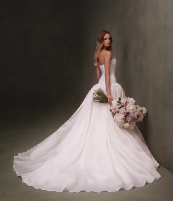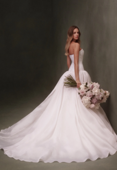 Expertly crafted with Silk Organza fabric, this dreamy ball gown features a strapless cut paired with a sleek, straight neckline that effortlessly frames the décolletage. Delicate ruching adorns the structured bodice before cascading into a dropped waistline. A full, pleated skirt flows into a breathtaking, long train to complete this romantic and feminine bridal look.