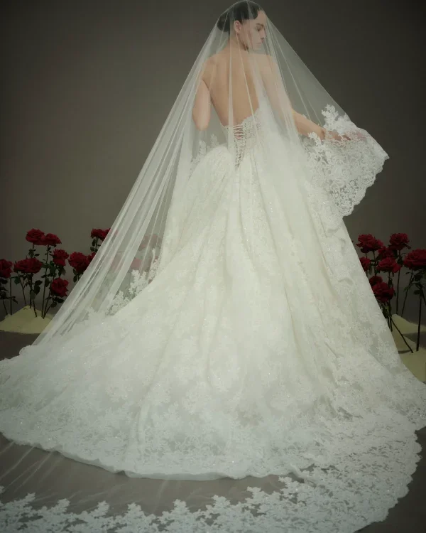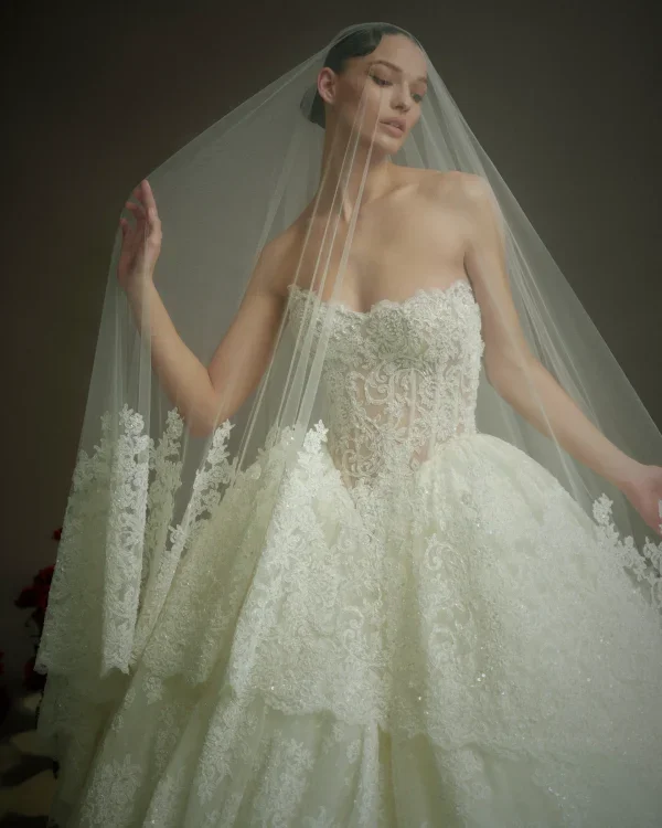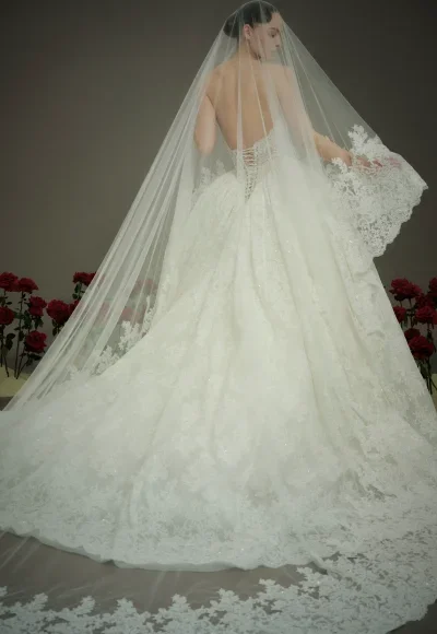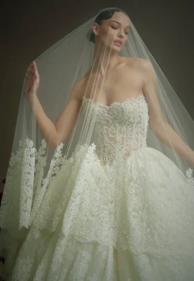 Dramatic and ornate, this romantic ball gown features a strapless cut and soft sweetheart neckline complete with a delicate lash trim. Expertly designed with exquisite Chantilly lace, intricate beading, sequins, and embellishment cascade and shimmer throughout the grandiose silhouette. The sheer corset bodice falls into a basque waistline before flowing into a full, pleated skirt and stunning train. Instantly elevate this couture bridal look with the gown’s matching cathedral-length veil.