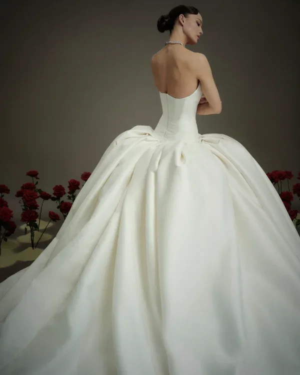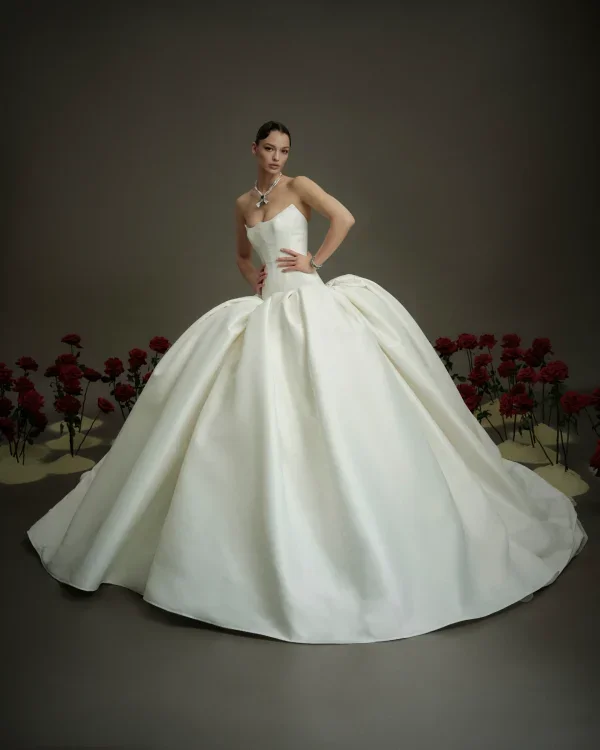 Dramatic and elegant, this grandiose ball gown features a strapless cut and striking scoop neckline with a center peak detail. The sleek and structured bodice falls to an extremely dropped waistline that elongates and sculpts the upper body. Expertly designed with a luxurious Silk Mikado fabric, the full, pleated skirt cascades into a beautiful train.