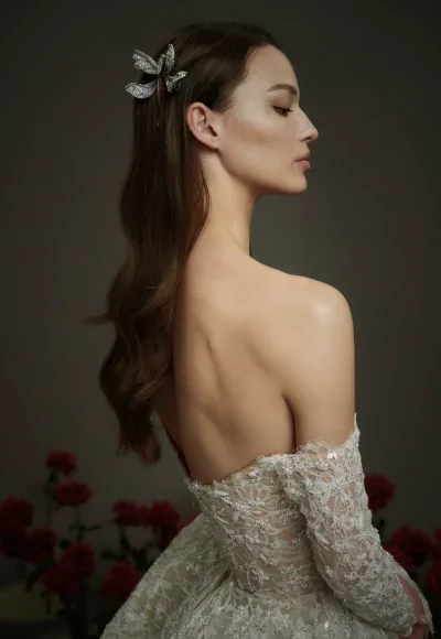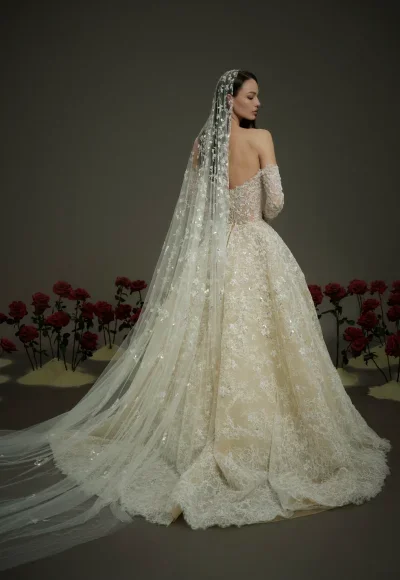 Dramatic and regal, this exquisite ball gown features a sweetheart neckline that cascades into delicate off-the-shoulder long sleeves. Expertly crafted with a traditional lace intricately embellished with shimmering sequins and beading, the sheer corset bodice sculpts the upper body before erupting into a statement-making full skirt. Instantly elevate this luxurious bridal look with the gown’s matching cathedral-length veil.