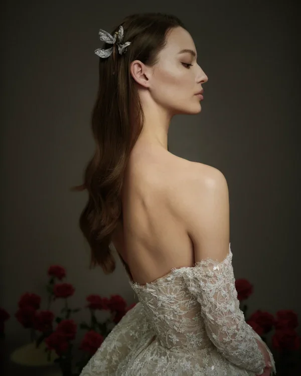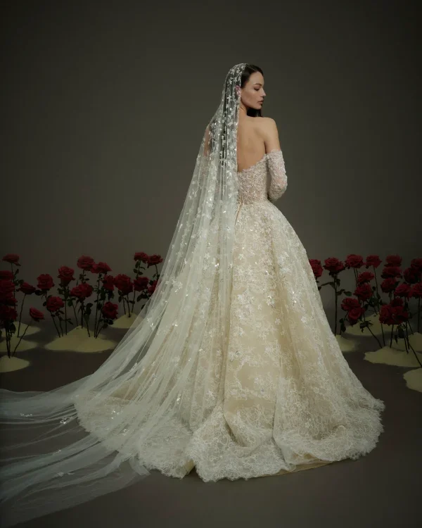 Dramatic and regal, this exquisite ball gown features a sweetheart neckline that cascades into delicate off-the-shoulder long sleeves. Expertly crafted with a traditional lace intricately embellished with shimmering sequins and beading, the sheer corset bodice sculpts the upper body before erupting into a statement-making full skirt. Instantly elevate this luxurious bridal look with the gown’s matching cathedral-length veil.