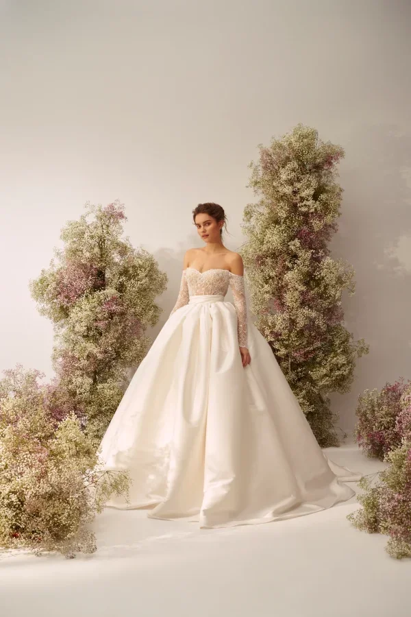 This elegant fit-and-flare gown features a stunning off-the-shoulder neckline that cascades into delicately beaded long sleeves. A sweetheart neckline effortlessly showcases the décolletage before melting into a structured corset bodice. The exquisitely embellished lace design continues throughout the figure-hugging silhouette before flowing into a minimal-length train. Instantly elevate this chic bridal look with the gown’s detachable silk overskirt.