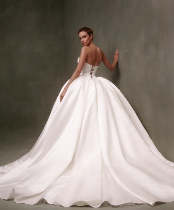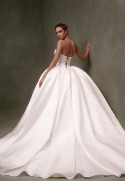 Simple yet striking, this ball gown features a strapless cut and classic sweetheart neckline that pairs beautifully with its sleek and structured corset bodice. Expertly crafted with satin fabric, the basque waistline meets a pleated, full skirt before cascading into a breathtaking train. To finish, the lace-up, corset back ensures an impeccable fit completing this timeless bridal look.