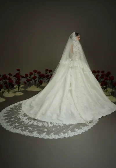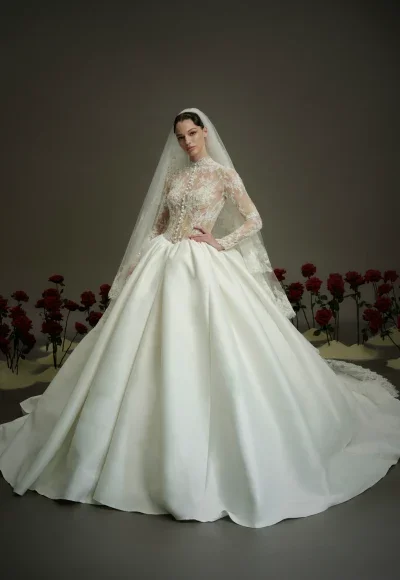 Exuding vintage elegance, this timeless ball gown features a high neckline and delicate long sleeves that create a chic spin on coverage and modesty. Expertly designed with embellished lace, the sheer corset bodice sculpts the upper body and is adorned with a simple row of fabric-covered buttons. Crafted with a luxurious Silk Mikado fabric, a full, pleated skirt erupts from the basque waistline completing this breathtaking bridal look.