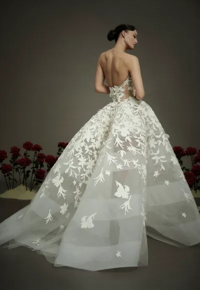 Daring and unique, this couture ball gown showcases a strapless cut and pointed sweetheart neckline that elegantly frames the décolletage. The sheer corset bodice sculpts the upper body while revealing exposed boning. Expertly designed with large-scale, hand-cut floral appliqués, the striking details cascade throughout the full, clover-style skirt with horsehair stripes.