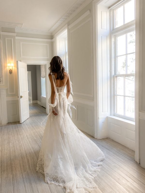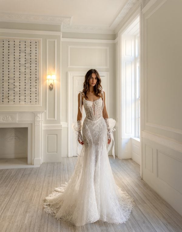 This chic and romantic fit-and-flare gown is delicately designed with exquisite Alençon lace. Dainty spaghetti straps, adorned with silk organza bows on the tip of the shoulders, melt into a scoop neckline, illusion plunge, and sheer, corset bodice. The dropped, basque waistline and lace-up back sculpts the upper body before cascading into figure-defining princess seams. Instantly elevate this feminine bridal look with the gown’s matching ruffle gloves.