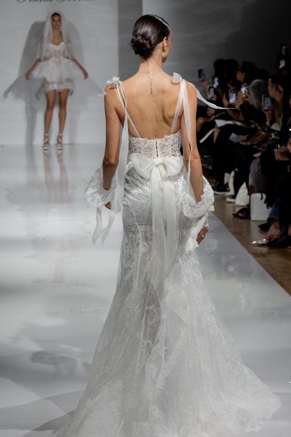 This chic and romantic fit-and-flare gown is delicately designed with exquisite Alençon lace. Dainty spaghetti straps, adorned with silk organza bows on the tip of the shoulders, melt into a scoop neckline, illusion plunge, and sheer, corset bodice. The dropped, basque waistline and lace-up back sculpts the upper body before cascading into figure-defining princess seams. [...]