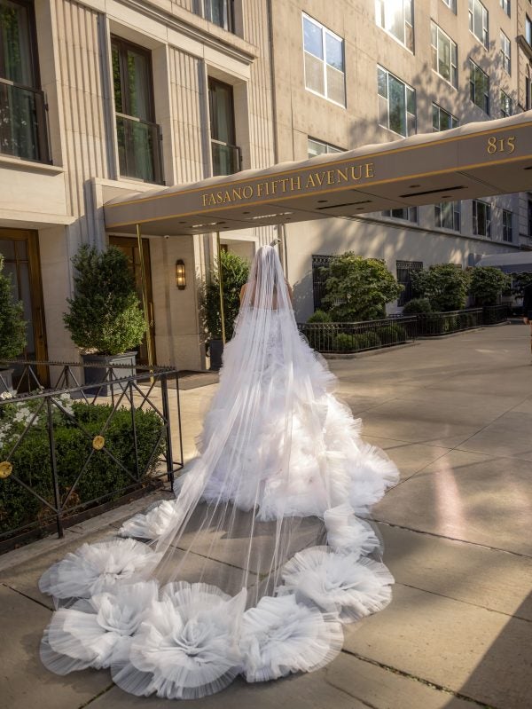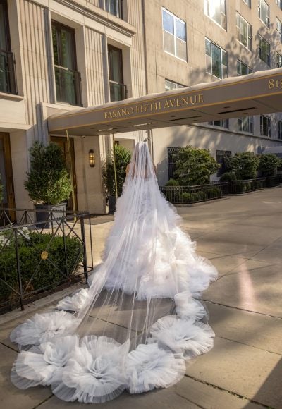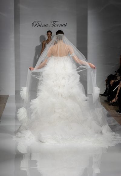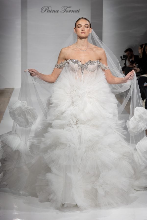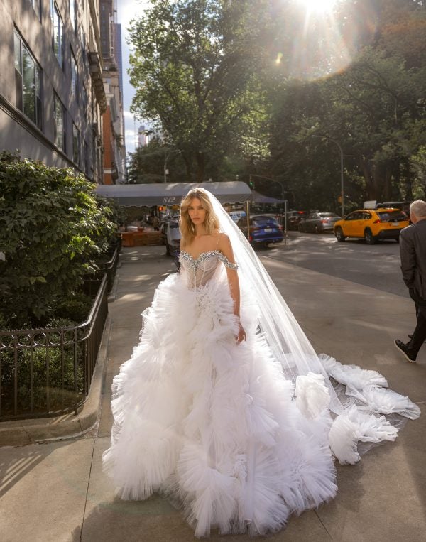 Exuding the world-renowned designer’s signature style, this iconic ball gown showcases a classic sweetheart neckline lavishly adorned with mirror crystals. Dainty spaghetti straps and embellished off-the-shoulder straps cascade from the strapless cut while a sheer, corset bodice, featuring pleated tulle, sculpts the upper body. To finish, a show-stopping full skirt consisting of pleated tulle and dimensional florals complete this dramatic and glamorous bridal look.