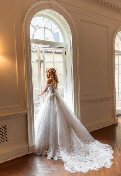 Float down the aisle in this spectacular, fully embroidered, Chantilly lace ball gown. Dainty spaghetti straps frame the décolletage before melting into a scoop neckline complete with an illusion plunge. Hand-beaded, three-dimensional, floral appliqués embellished with pearls cascade throughout the corset bodice and flow into the full skirt. To finish, the designer's signature lace-up back [...]