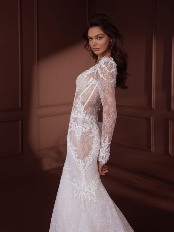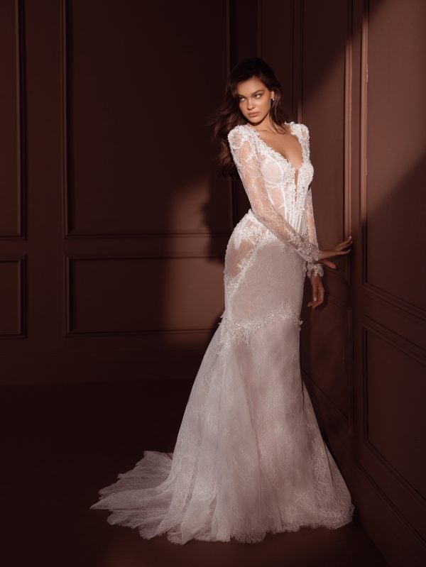 Fashion-forward and romantic, this figure-hugging gown features puffed long sleeves and a plunging V-neckline intricately embellished with shimmering water crystals. Expertly crafted with delicate Chantilly lace, the sheer corset bodice sculpts the upper body before melting into a fit-and-flare silhouette complete with sheer cutouts and cascading water crystal appliqués. An open back and aisle-worthy train complete this dramatic bridal look.