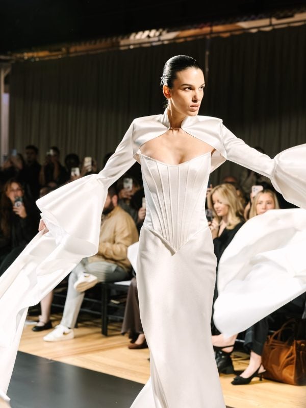 Chic and edgy, this simple fit-and-flare gown features a strapless cut and cat-eye neckline that elegantly frames the décolletage. Expertly crafted with double-face satin fabric, the corset bodice showcases exposed boning before meeting a basque waistline. Instantly elevate this modern and minimalist bridal look with the gown’s dramatic high-collar, floor-length bell sleeve bolero.