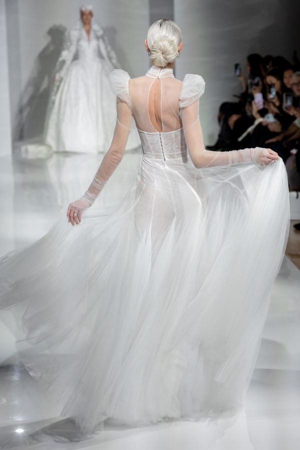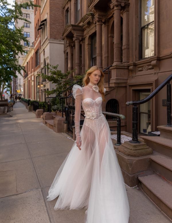 Chic and feminine, this soft A-line gown features a high illusion neckline complete with a ruched collar and long, statement-making, puff sleeves. The structured corset bodice showcases a sweetheart cut, exposed boning, and a basque waistline while floral, Chantilly lace adorns the lightweight bodysuit. The dreamy design is complete with a tulle, godet skirt and two hand-embellished, organza, floral appliqués placed at the collar and waistline.