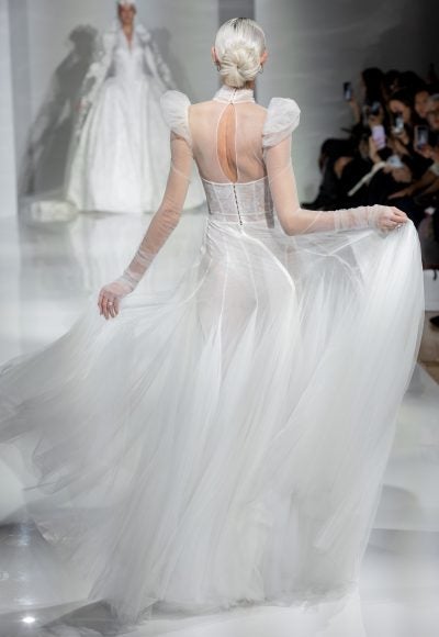 Chic and feminine, this soft A-line gown features a high illusion neckline complete with a ruched collar and long, statement-making, puff sleeves. The structured corset bodice showcases a sweetheart cut, exposed boning, and a basque waistline while floral, Chantilly lace adorns the lightweight bodysuit. The dreamy design is complete with a tulle, godet skirt and [...]