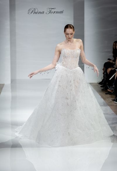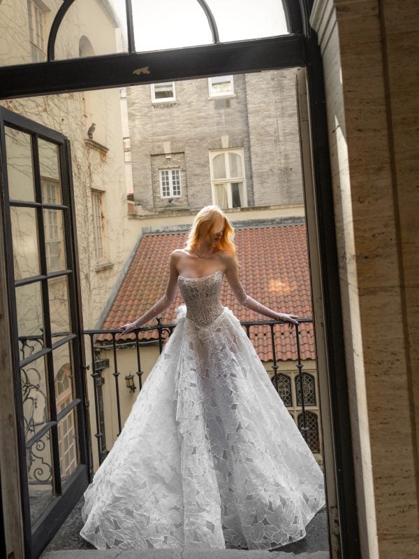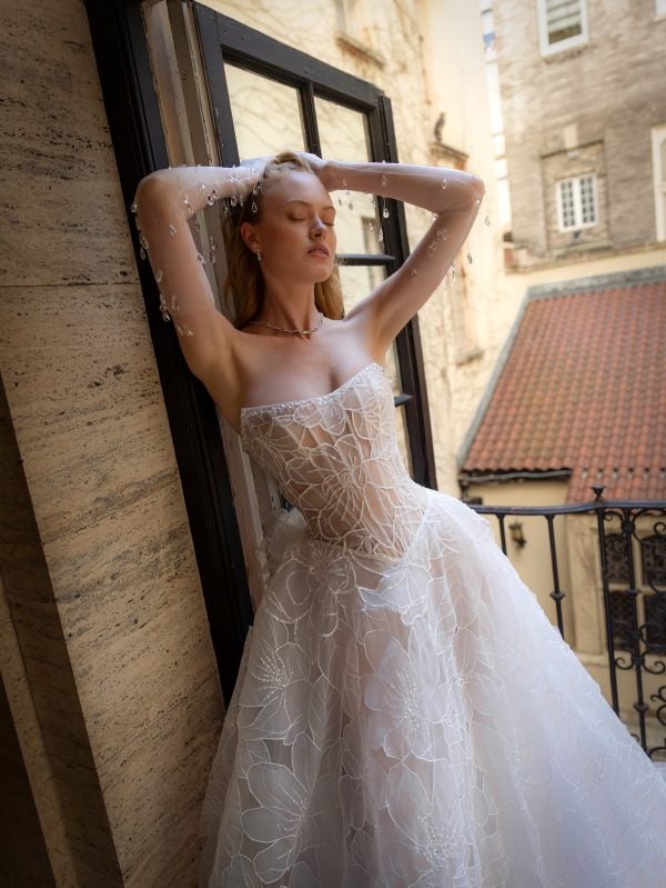 This dreamy A-line gown showcases an exquisite laser-cut, floral organza design from head to toe. The strapless cut is paired with a contemporary cat-eye neckline that frames the décolletage before cascading into a water crystal-embellished corset bodice. The basque waistline, lace-up back, and three-dimensional floral appliqué complete this ethereal bridal look. To finish, add the gown’s matching embellished gloves.