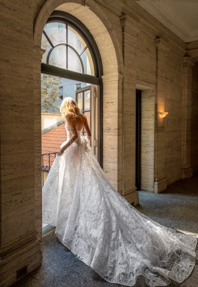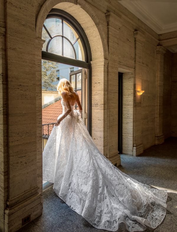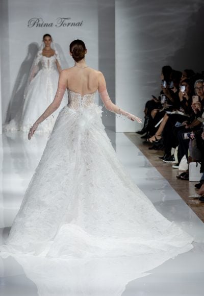 This dreamy A-line gown showcases an exquisite laser-cut, floral organza design from head to toe. The strapless cut is paired with a contemporary cat-eye neckline that frames the décolletage before cascading into a water crystal-embellished corset bodice. The basque waistline, lace-up back, and three-dimensional floral appliqué complete this ethereal bridal look. To finish, add the [...]