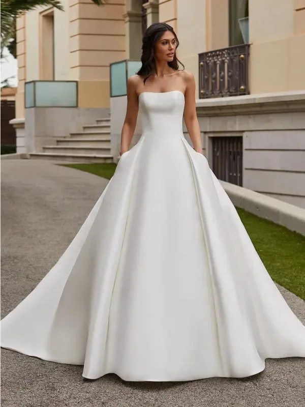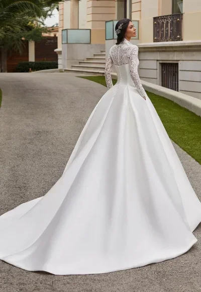 Expertly crafted in silk Mikado fabric, this elegant ball gown is ideal for the bride seeking a regal bridal look. Streamline and simple, Jory features a strapless neckline and elongated bodice. Princess seams contour the body before flaring out into a dramatic, full skirt with pockets. Instantly elevate and add modesty to this timeless bridal [...]