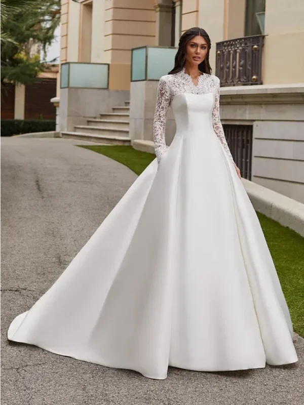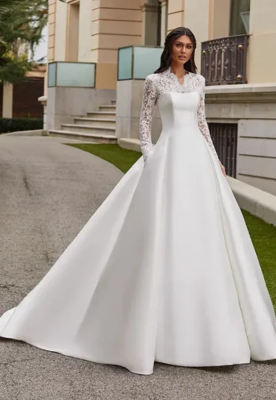 Expertly crafted in silk Mikado fabric, this elegant ball gown is ideal for the bride seeking a regal bridal look. Streamline and simple, Jory features a strapless neckline and elongated bodice. Princess seams contour the body before flaring out into a dramatic, full skirt with pockets. Instantly elevate and add modesty to this timeless bridal look with the gown’s detachable lace long sleeve topper.