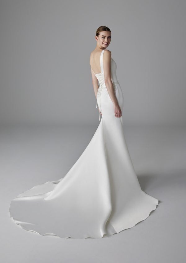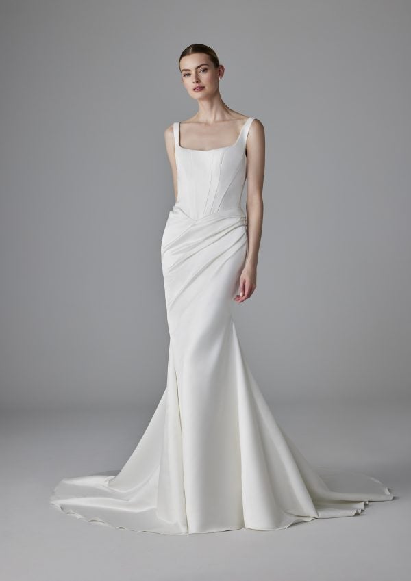 Featuring exceptional craftsmanship and timeless simplicity, this figure-defining gown showcases a square neckline and open back. Adorned with exposed boning, the corset bodice and basque waistline sculpt the upper body while the lace-up closure ensures an impeccable fit. Hand-placed draping complements the sleek skirt while a breathtaking train elegantly trails behind.