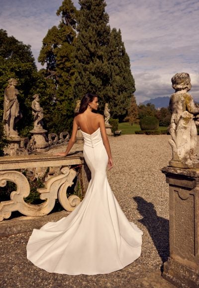 This elegant fit-and-flare gown features a strapless cut paired with a sweetheart neckline adorned with crystal embellishment that peeks out from the scooped bodice. Crafted with luxurious matte satin fabric, intentionally-draped ruching wraps around the upper body before cascading into a streamline silhouette. Elements such as the effortlessly-elongating princess seams, fabric-covered buttons, and circle-cut train contribute to the impeccable craftsmanship of this timeless bridal look.