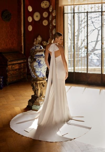 Chic and sophisticated, the Fergie gown features a seamless fit-and-flare silhouette in a smooth crepe fabric. The halter neckline exudes an elegant yet fashion-forward aesthetic while the open back and bow detail make for a dramatic bridal statement.