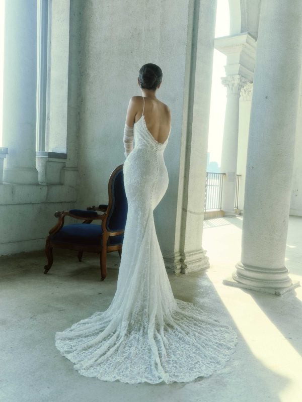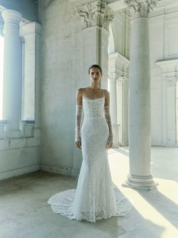 Chic and ethereal, this sheath gown features delicately-beaded spaghetti straps and a scoop neckline that elegantly frame the décolletage. Expertly designed with floral-inspired lace, tonal embellishment creates irresistible shimmer throughout the figure-hugging silhouette. Crafted with silk tulle, the softly-draped bodice, low backline, and a row of pearl buttons complete this feminine bridal look. Instantly elevate the romantic ensemble with ruched, tulle gloves.