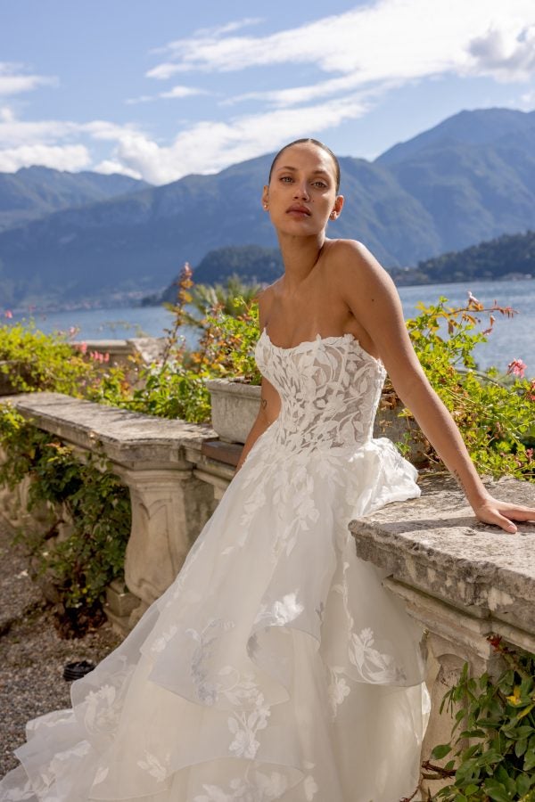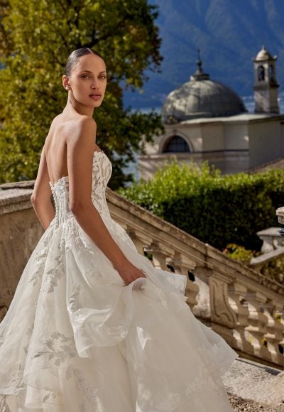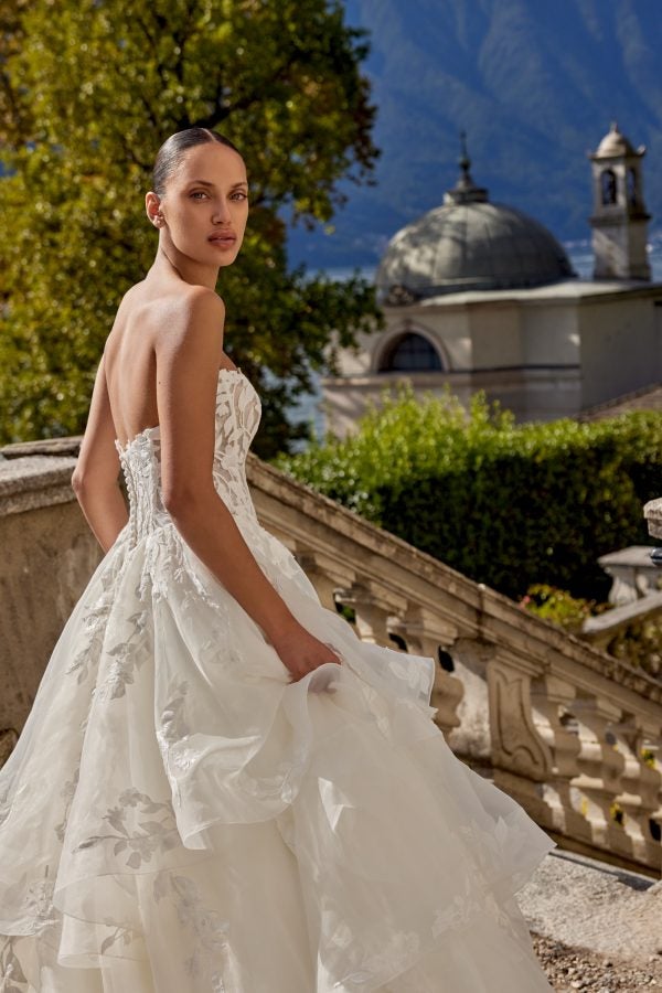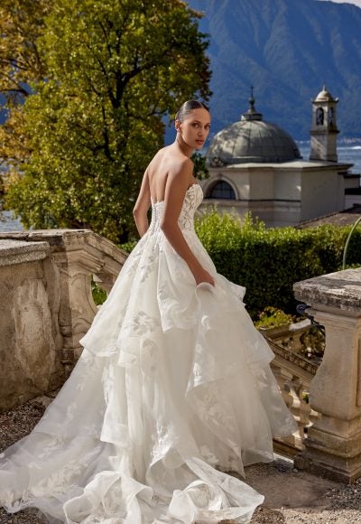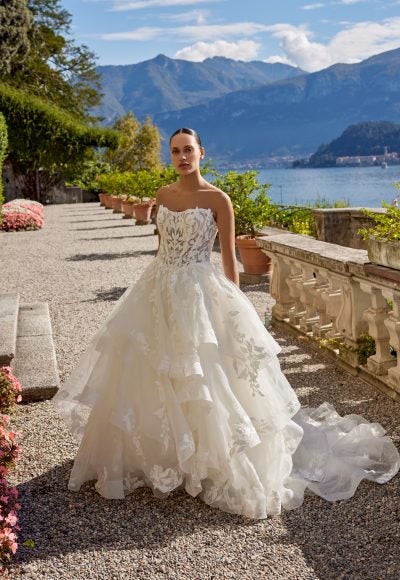 This dreamy, organza ball gown features a strapless cut and cat-eye, scoop neckline that elegantly frames the décolletage. Complete with a layer of patterned shimmer tulle, the sheer corset bodice is adorned with matte lace embroidery and leaf-inspired appliqués that cascade into the full skirt. Voluminous ruffled tiers are showcased throughout the dramatic skirt before flowing into a chapel-length train complete with a horsehair trim. Fabric-covered buttons adorn the back completing this romantic bridal look.