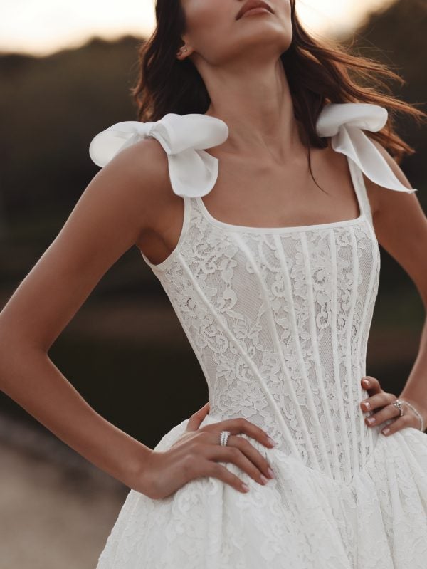 This romantic ball gown showcases an elegant square neckline that frames the décolletage. Flouncy and feminine double organza bows adorn each shoulder while a corset bodice, complete with exposed boning, effortlessly sculpts the upper body. A dramatic basque waistline meets a gathered, full skirt that is bound to turn heads. Expertly crafted with exquisite Alençon lace from head to toe, the delicate lash trim adorns the hem and flows into the rounded train.