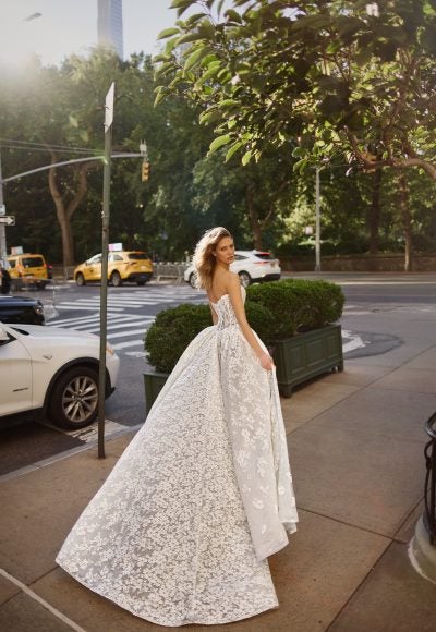 Showcasing a dramatically dropped, basque waistline, this breathtaking ball gown is crafted with exquisite floral lace from head to toe. The strapless, straight-across neckline frames the décolletage while a sheer corset bodice effortlessly sculpts the upper body. To finish, the shimmer-infused fabric adds an undeniably eye-catching and feminine element while a train elegantly trails behind.