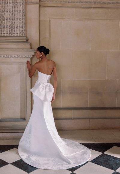 Sleek and romantic, this figure-hugging gown features a strapless cut, classic tulip neckline, and impeccably hand-draped bodice. Meticulously designed with Italian jacquard fabric, the floral-inspired design cascades into the fit-and-flare silhouette. A statement-making, detachable bow and round-cut train completes this timeless bridal look.