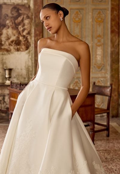 Chic and romantic, this Silk Mikado A-line gown features a strapless cut paired with a straight, cuffed neckline. The sleek and structured bodice sculpts the upper body before meeting a natural waistline that flows into a simple skirt with pockets. Exquisite floral embroidery and embellishment decorates the lower half of the skirt while a row of fabric-covered buttons extends to the end of the chapel-length train. To finish, a statement-making bow adorns the back of this timeless bridal look.