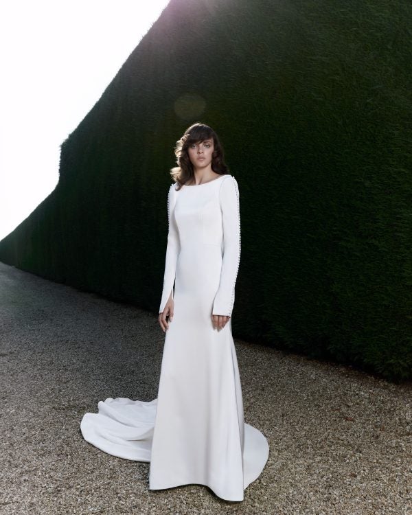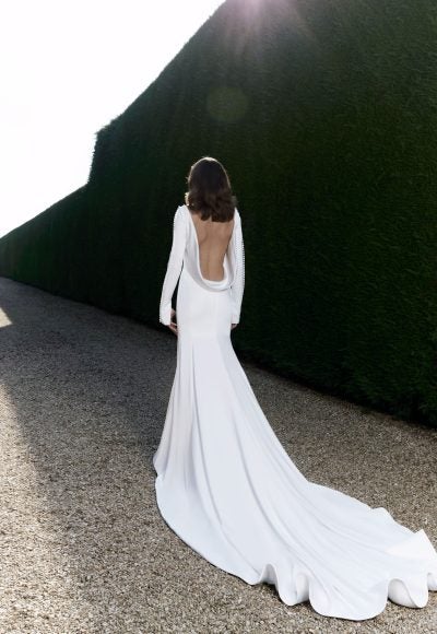 Chic and sophisticated, this sheath gown features a bateau neckline that elegantly frames the collarbones before cascading into fitted, long sleeves adorned with a row of fabric-covered buttons. Expertly designed with Silk Charmeuse Satin fabric, the sleek silhouette is paired with a dramatically low, open back complete with a cowl detail. A breathtaking train completes this minimalist yet fashion-forward bridal look.