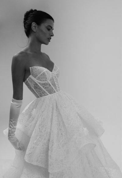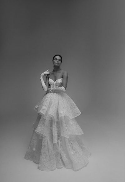 Exuding whimsical romance, this soft ball gown features a strapless cut paired with a contemporary sweetheart neckline. Expertly crafted with delicate floral lace, the corset is adorned with exposed boning and buttons that cascade down the center of the sheer bodice. The voluminous tiered skirt adds a dramatic and undeniably feminine touch before flowing into an aisle-worthy train.