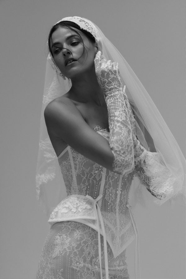 Showcasing vintage-inspired romance, this figure-hugging two-piece gown combines a strapless corset bodice with a fit-and-flare skirt. Exposed boning, delicate pearl beading, and a peplum detail complete with dainty bows contribute to the ensemble’s fashion-forward edge. Featuring a delicate lace design from head to toe, the expert craftsmanship ensures an impeccable fit. Instantly elevate this chic bridal look with the gown’s detachable overskirt, lace gloves, and veil.
