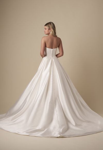 Minimalism meets modern yet timeless elegance with this sleek A-line gown. Expertly crafted with silk Mikado fabric, its strapless cut is paired with a cat-eye, sweetheart neckline that frames the décolletage. Intentionally-draped ruching adorns the structured bodice before melting into an effortlessly full skirt complete with subtle pleating and a slit. Best of all, a row of fabric-covered buttons cascade into the classic gown’s aisle-worthy train.