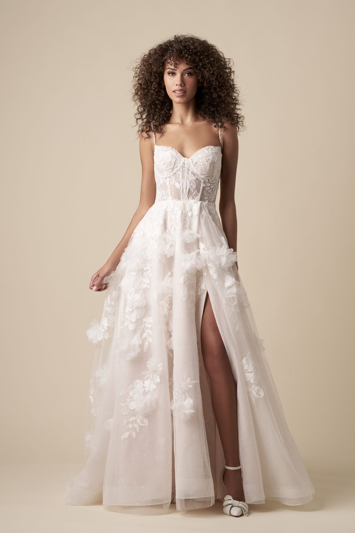 This textured A-line gown showcases exquisite floral embroidery, shimmering embellishment, and statement-making, three-dimensional organza florals. Equally modern and romantic, delicate spaghetti straps frame the décolletage before melting into a sheer corset bodice with exposed boning. The full skirt features a leg-bearing slit while an aisle-worthy train is complete with a flurry of the enchanting details and a row of pearl buttons.
