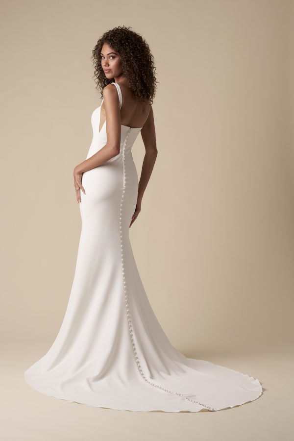This stunningly simple sheath gown is expertly crafted with crepe fabric from head to toe. Perfectly-cut straps form an elegant square neckline and beautifully open back. Seams are intentionally placed throughout to accentuate the body while fabric-covered buttons cascade into the clean and classic train.