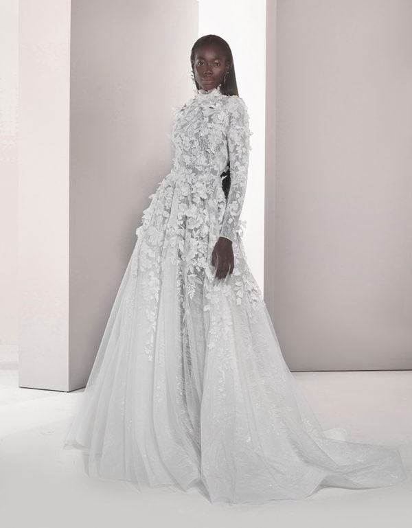 This striking A-line gown features a chic high neckline and elegant long sleeves. Intricately crafted with delicate lace and three-dimensional floral embroidery, the exquisite details create undeniably striking texture and dimension. The organic-inspired, hand-sewn appliqués cascade and disperse into the effortlessly full, tulle skirt.