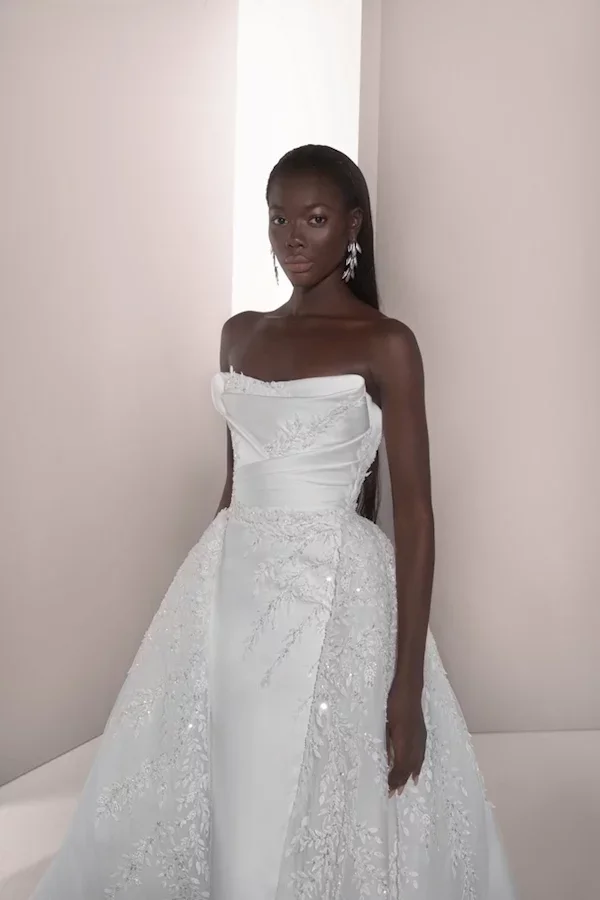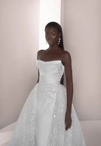 Showcasing impeccable couture craftsmanship, this fitted gown features a strapless cut and cat-eye neckline that elegantly frame the décolletage. Shimmering hand embellishment, organic-inspired appliqués, and draping adorn the structured bodice before meeting a natural waistline and figure-hugging skirt crafted with stretch satin. Instantly elevate this modern bridal look with the gown’s detachable tulle overskirt.